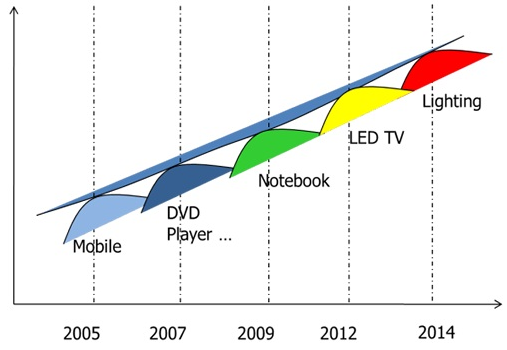 綜觀LED的發(fā)展過程,2002年起LED從小尺寸顯示器(主要應用在手機上)開始滲透,在2005年達到高峰。但是隨著效率的提升,單位顯示器使用的LED顆數(shù)也逐漸減少。當手機成長趨于飽和狀態(tài)下,LED總需求量便開始下滑。在此時LED便開始尋找下一個應用:中尺寸顯示器。隨著性價比的不斷提升,LED于2007年在中尺寸顯示器的需求達到飽和,與先前小尺寸一樣LED需求開始往下。LED開始進入到另一個應用:筆記本電腦顯示器,并于2009年底開始進入電視顯示器的應用。隨著LED在大尺寸顯示器的廣泛應用,LED的性能已經(jīng)提升到每瓦100流明以上,而價格也快速下降,此趨勢對于LED在照明應用的發(fā)展有著無比的助力。