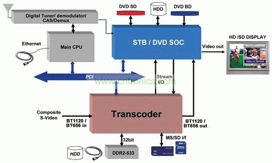 轉碼硬件必須與整個 STB 系統中的其他系統進行良好交互,其中包括數字調諧器、解多路復用器 (Demuxer) 和解調器、DDR2 存儲器、PCI 總線,以及向 STB SoC 傳輸音/視頻的高帶寬接口。圖 2 給出了常見的架構示意圖,但這不一定是一般性架構。