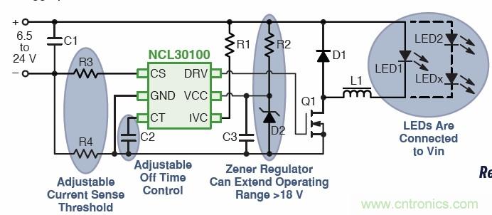 針對(duì)空間及高能效要求的低功率應(yīng)用,安森美半導(dǎo)體提供一款能效高達(dá)95%,又具有自然LED開(kāi)路保護(hù)的固定關(guān)閉時(shí)間降壓LED驅(qū)動(dòng)器控制器NCL30100。該器件采用準(zhǔn)固定關(guān)閉時(shí)間、峰值電流遲滯控制方法,不要求補(bǔ)償元件;其低邊N-FET開(kāi)關(guān)拓?fù)溥m合連續(xù)導(dǎo)電模式工作,無(wú)須輸出電容;其工作頻率小于500 kHz,±5%典型穩(wěn)流容限,VCC工作電壓范圍為6.35至18 V。
