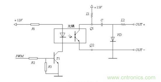PWM.控制電路由光電耦合器和一個(gè)Cuk電路[3]組成。在此控制電路中,光電耦合器能夠有效抑制接地回路的噪聲,消除地干擾,提高了整個(gè)系統(tǒng)的抗干擾能力;光電耦合器把輸入端(單片機(jī)AT89C51)和輸出端(半導(dǎo)體制冷片TEC)電氣隔離,避免了主控芯片AT89C51受到意外傷害,有效保護(hù)了單片機(jī)AT89C51.另外,此控制電路中還利用光電耦合器組成了開關(guān)電路,節(jié)省了開關(guān)器件的使用。Cuk直流斬波電路的功能是將+15V的外接電源轉(zhuǎn)變?yōu)榭烧{(diào)電壓的直流電,即Cuk電路輸出端的電壓(半導(dǎo)體制冷片TEC的工作電壓)是可調(diào)的。輸出端OUT+和OUT-之間的可調(diào)電壓是受Q1端和Q2之間的關(guān)斷頻率控制的。在此控制電路中選用Cuk電路,因?yàn)镃uk斬波電路有一個(gè)明顯的優(yōu)點(diǎn),即其輸入電源電流和輸出負(fù)載電流都是連續(xù)的,且脈動(dòng)很小,有利于保證半導(dǎo)體制冷片TEC處于良好的工作狀態(tài)。