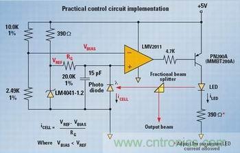 采用一個(gè)4.7k的電阻來(lái)限制PN200A PNP晶體管基極電流,該電阻將電流限定在1mA左右。該晶體管的(值約為100,因此它所提供的最大電流約為100mA,這已經(jīng)超出小型SOT-23封裝的散熱范圍。為防止晶體管的過(guò)高熱量,將一個(gè)限流電阻與LED或激光二極管串聯(lián),使該二極管達(dá)到最大工作負(fù)荷,從而限定晶體管集電極的電流。如果需要更大的電流,則須選用集電極電流大的晶體管,而且要采用SOT-223等較大的封裝。為了限定電路帶寬以維持穩(wěn)定性,選用一個(gè)15pF的電容與光電二極管電容并聯(lián)(在1.2VBIAS時(shí)其電容大小也約為15pF),從而將放大器的工作頻率限定在250kHz左右。