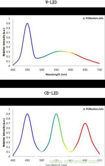 不管是投影儀還是電視機都采用的是RGB-LED光源,也就是紅黃藍三色LED光源,而這3種顏色的LED,以“藍光LED”最為重要,減弱藍光則會使色彩失真,整體畫面色調(diào)偏紅黃。一起看看LED顯示器兩種主要發(fā)光模塊W-LED(常用)和GB-LED的光譜組成。如下圖: