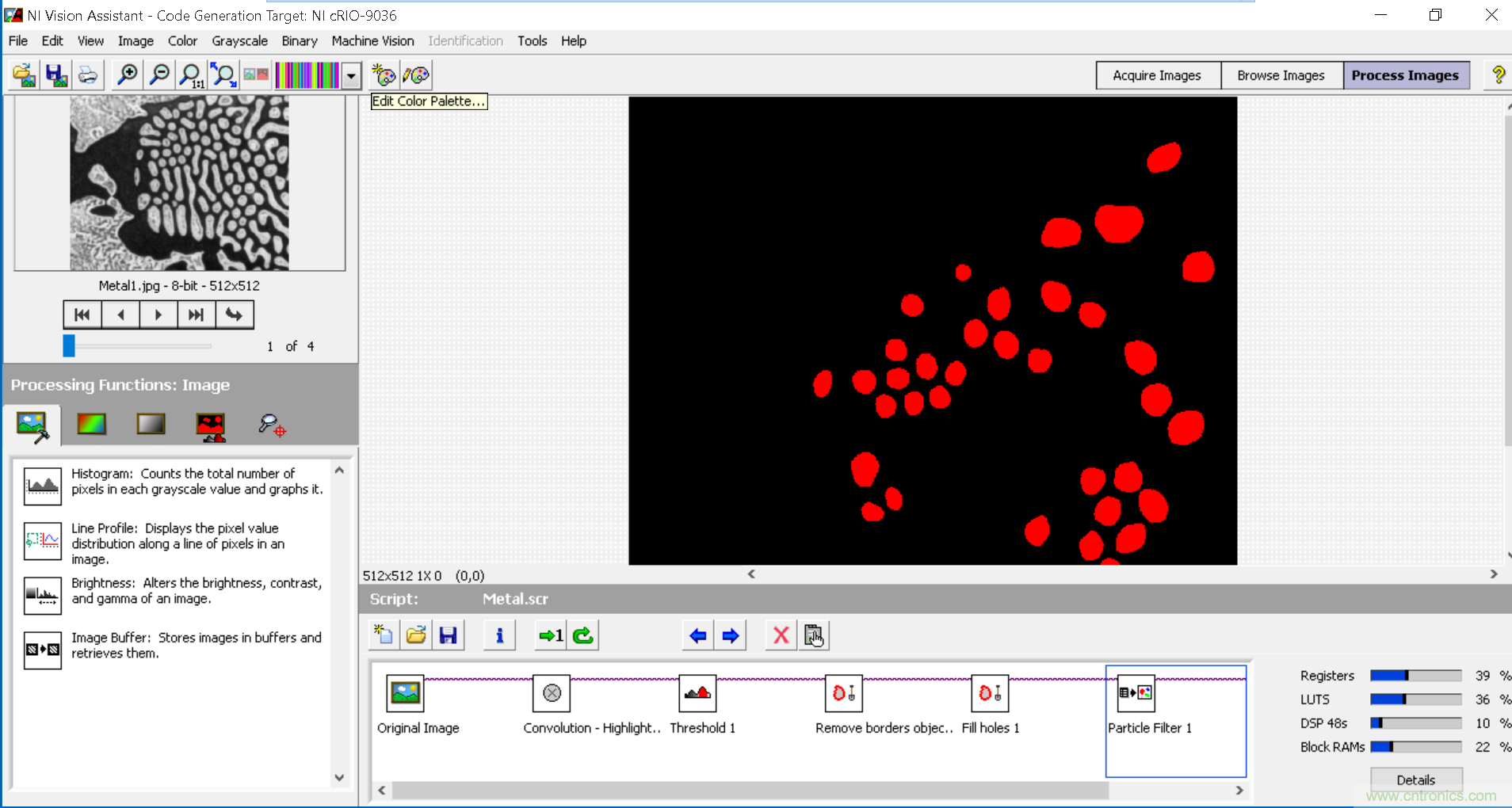 為了實(shí)現(xiàn)生產(chǎn)率的最大化,不論使用哪種處理平臺(tái),都需要立即獲得關(guān)于算法的反饋和基準(zhǔn)測試信息。當(dāng)使用迭代探索性方法時(shí),實(shí)時(shí)查看算法結(jié)果將會(huì)節(jié)省大量時(shí)間。什么是正確的閾值?用二進(jìn)制形態(tài)濾波器剔除的顆粒多大或多???哪種圖像預(yù)處理算法和算法參數(shù)可以最好地清理圖像?這些都是開發(fā)視覺算法時(shí)的常見問題,而關(guān)鍵在于是否能夠更改并快速查看結(jié)果。然而,傳統(tǒng)的FPGA開發(fā)方法可能會(huì)減緩創(chuàng)新,因?yàn)樗惴ǖ拿總€(gè)設(shè)計(jì)變化之間需要編譯時(shí)間??朔@一點(diǎn)的一個(gè)方法是使用一個(gè)算法開發(fā)工具,可讓您在同一個(gè)環(huán)境進(jìn)行CPU和FPGA的開發(fā)工作,而不會(huì)在FPGA編譯時(shí)陷入困境。NI Vision Assistant是一種算法工程工具,用于開發(fā)部署到CPU或FPGA上的算法,以幫助您簡化視覺系統(tǒng)設(shè)計(jì)。您還可以使用Vision Assistant在目標(biāo)硬件上編譯和運(yùn)行之前測試算法,同時(shí)輕松訪問吞吐量和資源利用率信息。