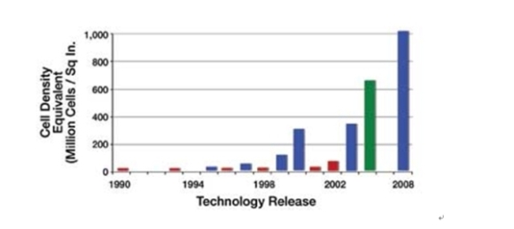 圖2顯示了Fairchild公司≤30V的N溝道MOSFET單元密度的進步。每個條形都表示新的工藝進步。可以看到,在最近的十年中,單元密度從3200萬單元/平方英寸增加到現在的10億單元/平方英寸。