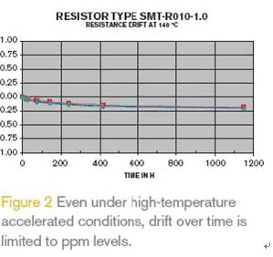 圖2 是表面貼裝電阻的典型長期穩定性曲線,可以看出在140°C下老化1000小時后阻值只有大約 0.2%的輕微漂移,這是由于生產過程中輕微變形而導致的晶格缺損造成的。阻值漂移很大程度上由高溫決定,因此在較低的溫度下比如+100°C,這種漂移實際是檢測不出來的。