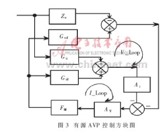 AVP有源控制為雙環控制,其基本原理如圖2所示。通過檢測電感電流,根據降壓要求相應調節輸出電壓的基準。輸出電壓跟隨基準電壓而實現AVP控制。圖3為AVP有源控制的方塊圖,假設電流環增益為Ti,電壓環增益為Tv,則: