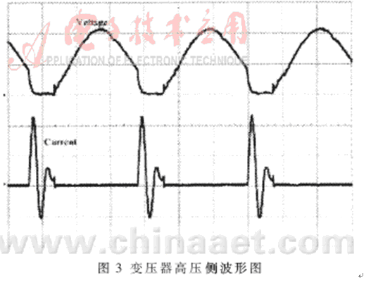 研制的高壓窄脈沖電源改善了高壓荷電系統(tǒng)的性能且穩(wěn)定性好。實際運行表明,電源輸出電壓峰值為0~30kV,頻率為15kHz,脈寬為500ns~800ns。脈沖供電與直流供電相比,其起暈電壓低50%以上。此種電源功率變壓器的輸入頻率大幅度提高,同時變壓器和平波電抗器體積重量大為減小,且電源輸出紋波小、響應速度快。變壓器高壓側(cè)波形如圖3所示。