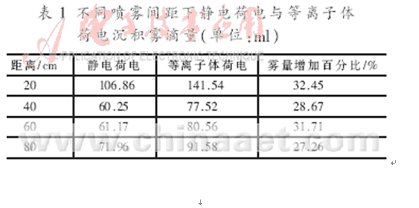 由表1可以看出,由于使用了等離子體荷電噴霧技術(shù),農(nóng)藥落在植株上的藥量有了明顯的增加,達到了設(shè)計要求。由表2可見,等離子體荷電與普通靜電噴霧相比,能在較小的放電電壓下得到較高的荷質(zhì)比。從而降低了農(nóng)藥的使用量,也減輕了對環(huán)境的污染。