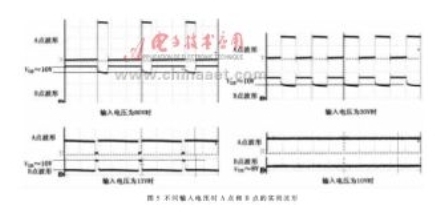 圖5為當輸出電壓為10V、電流為2A時,在不同輸入電壓狀態下,圖3中A點和B點的實測波形。由圖5可知,當輸入電壓為13V時,MOSFET關斷時間很短,當輸入電壓為10V時,MOSFET則一直導通。