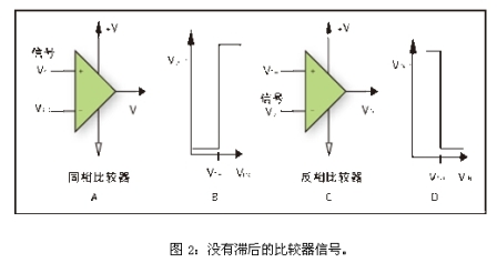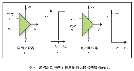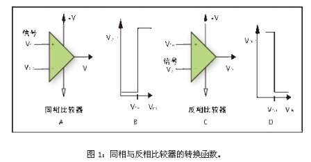 圖1B和1D給出了比較器電路的轉(zhuǎn)換函數(shù)。同相比較器被定義為在輸入信號大于門限電壓時輸出為正的比較器,而反相比較器被定義為輸入信號大于門限電壓時輸出為負的比較器。