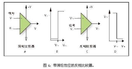 圖3C是帶滯后功能的反相比較器,+IN引腳上的電壓等于等式4: