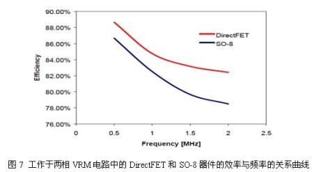 圖7示出了工作于兩相VRM電路中的DirectFET和SO-8器件的效率與頻率的關系曲線。兩者的效率測量都是在20A/相位的負載電流條件下進行。在整個頻譜范圍內(nèi),采用DirectFET的VRM電路表現(xiàn)出高于采用SO-8的VRM電路的效率水平。兩種電路的效率差異還會隨著頻率的升高而增大。該結(jié)果反映出DirectFET器件的封裝寄生損耗較SO-8器件低。DirectFET封裝器件還能夠在更高的負載電流條件下工作。例如,在1MHz條件下,DirectFET VRM電路能夠?qū)Ω哌_30A/相位的負載電流進行開關操作,并同時將電路板的溫度維持在100℃以下。而在相同的工作條件下,SO-8器件則只能對20A/相位左右的負載電流進行開關操作。DirectFET VRM電路較高的電流處理能力可歸功于結(jié)合了更低的封裝寄生效應以及更高的熱