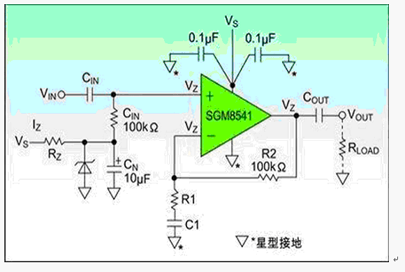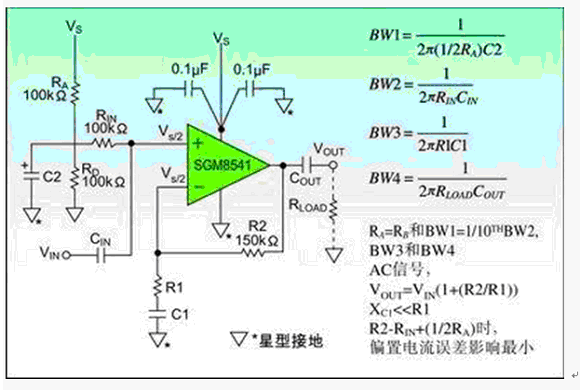 首先,電路的電源抑制幾乎沒(méi)有,電源電壓的任何變化都將直接通過(guò)兩個(gè)分壓電阻改變偏置電壓Vs/2,但電源抑制的能力是電路非常重要的特性。例如此電路的電源電壓1伏的變化,能引起偏置電路電壓的輸出Vs/2變化0.5伏。該電路的電源抑制僅僅只有6dB,通過(guò)選用SGM8541運(yùn)算放大器可以增強(qiáng)電源抑制能力。