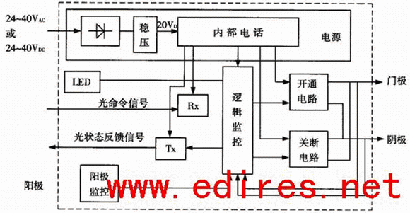 光控接口采用在工業生產中廣泛使用的標準元器件,它由Agilent技術生產的HFBR系列,推薦的標準型號光纖是1mm POF(塑料光纖) ,既經濟又便于使用。對于超過15m的長距離推薦使用200μm的HCS光纖(硬包層石英光纖) 。光接收器:Agilent HFBR22528型,光輸入功率Poncs>- 21dBm(1 mm POF) , 光噪聲功率Poffcs <- 40dBm,光脈沖寬度門檻tGLITCH≤400ns ,對寬度≤400ns的光信號沒有響應。