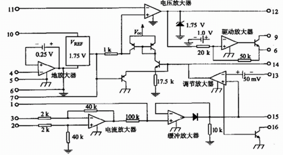 UC3907的內(nèi)部結(jié)構(gòu)如圖1所示。可分為電壓環(huán)與電流環(huán)(包括均流控制) 兩部分。其中電壓環(huán)由電壓放大器、接地放大器和驅(qū)動放大器構(gòu)成。電流環(huán)由電流放大器、緩沖放大器、調(diào)節(jié)放大器和狀態(tài)指示構(gòu)成。