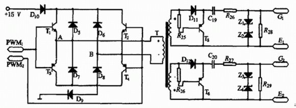 該系統(tǒng)主電路的開關(guān)管使用IGBT, 用脈沖變壓器作驅(qū)動。當(dāng)IGBT容量較小時UC3846的11腳和14腳可以直接驅(qū)動變壓器; 當(dāng)IGBT容量較大時, 可以采用圖3所示的驅(qū)動電路。該驅(qū)動電路結(jié)構(gòu)簡單, 具有負(fù)壓關(guān)斷能力, 且驅(qū)動功率大。電路中, 二極管D9、D10有助于T1~T4的關(guān)斷。