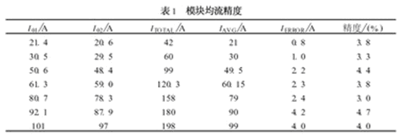 用兩個電源模塊作并聯(lián)實驗, 實驗數(shù)據(jù)見表1所列。由表1知, 它的負(fù)載均流精度(負(fù)載不平衡度)控制在5%以內(nèi)。