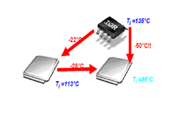 以一個每相30A的多相變換器為例,要滿足這個電流,用最好的單面散熱的SO8封裝MOSFET,比如標準的SO-8,無底的SO-8和無鉛的SO-8,每相要用五只,而雙面散熱的DirectFET 只需兩只。比較結果元件數減少了60%。