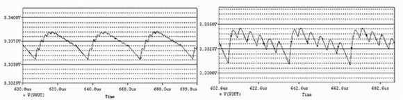 此DC/DC轉(zhuǎn)換器在低電壓0.9V下就可以正常工作;典型的輸入/輸出值為:VIN=2.4V,VOUT=3.3V,模擬結(jié)果如圖5、圖6所示。