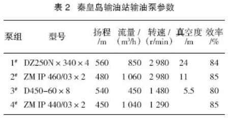 秦皇島輸油站輸油設(shè)備如表2、表3所列。秦皇島輸油站配備4臺(tái)輸油泵機(jī)組,并聯(lián)方式,直接抽10萬m3油罐外輸,且只能一臺(tái)泵機(jī)組運(yùn)行。其中1#泵機(jī)組配有液力耦合器調(diào)速裝置,其它3臺(tái)均無調(diào)速裝置。冀東原油混入后,出現(xiàn)1#、2#、4#泵機(jī)組配置明顯偏大,而3#泵機(jī)組配置又有所偏低的狀況,致使輸油站外輸量降低。目前運(yùn)行中以帶液力耦合器的1#輸油泵機(jī)作為主力,該泵機(jī)組為上世紀(jì)90年代初期國(guó)產(chǎn)產(chǎn)品,效率低,故障率高;而于2003 年與2004年相繼更換的2#、4#泵機(jī)組(進(jìn)口設(shè)備)因揚(yáng)程、排量過大,目前基本處于閑置狀態(tài)。