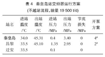 秦皇島站運(yùn)行4#輸油泵節(jié)流損失0.80 MPa,運(yùn)行2#輸油泵節(jié)流損失1.2 MPa,浪費(fèi)很多電能,并且運(yùn)行中這兩臺(tái)泵的震動(dòng)很大。綜合考慮(冀東油田來油量逐年遞增,秦皇島外輸量逐年遞減,輸量不穩(wěn)定)通過采用更換或切削泵葉輪的方案解決該站節(jié)流損失的方案不可取,應(yīng)考慮在秦皇島站增加調(diào)速裝置,調(diào)節(jié)揚(yáng)程及輸量。故采用了表4所列的變頻器運(yùn)行方案。