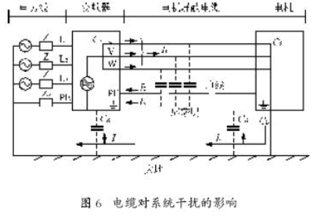 頻率范圍為150 kHz~30 MHz的電子干擾一般來自傳導。傳動系統中范圍為30 MHz~1 GHz 的空間輻射干擾產生于逆變器,電機電纜及電動機。由于電動機電壓較高的dv/dt 以及電機電纜上的容性電流產生了漏電流,而且使用屏蔽的電機電纜也會增加漏電流,如圖6所示。