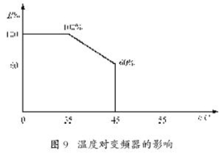 變頻器主要由各種電子元器件組成,它對于工作環境的要求較高,當環境溫度超過它的最高工作溫度時,變頻器必然會降低其持續電流輸出的額定值,如圖9所示。
