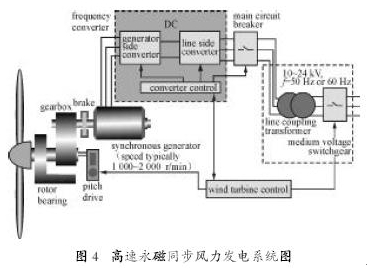 對數為200,很難實現,因此該方案必須使用升速齒輪箱,配高速異步電機(通常采用6極電機)。升速齒輪箱速比大,負荷重,隨風速變化波動大且頻繁,造價高、易疲勞損壞是該方案的主要缺點,另外繞線式異步電機的電刷和滑環也會影響系統的可靠性,增加維護工作量。