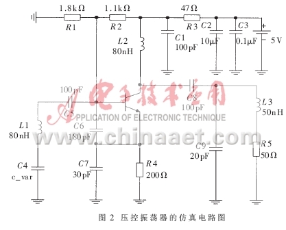 壓控振蕩器(VCO)是鎖相環路的重要組成部分。隨著電子技術的發展,出現了許多集成的VCO芯片??紤]到高頻率穩定度、低相噪的要求,這里采用Agilent公司生產的低噪聲晶體管HBFP0450來設計VCO。常用的VCO一般有三種:晶體壓控振蕩器、LC壓控振蕩器和RC壓控振蕩器。對于超高頻段的VCO,采用LC振蕩器形式;為了提高頻率穩定性,采用了克拉潑電路,并進行了相角補償。