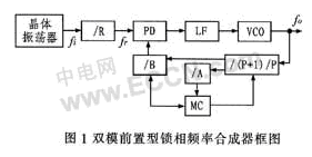 圖1中,(P+1)/P為高速雙模前置分頻器,分頻模數(shù)為P+1和P;A為吞脈沖可編程計(jì)數(shù)器;B為主可編程計(jì)數(shù)器;MC為??刂七壿嬰娐?。其分頻比為N=(P+1)A+P(B-A)=PB+A (1)