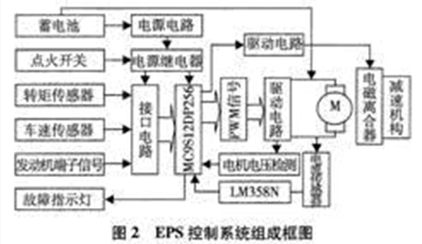 電動助力轉向系統(EPS)主要包括傳感器、控制器和執行器三大部件。傳感器將采集到的信號經過相應處理后輸人到控制器,控制器運行內部控制算法,向執行器發出指令,控制執行器的動作,系統結構如圖1所示。其工作原理為:在操縱方向盤時,轉矩傳感器根據輸人轉向力矩的大小,產生出相應的電壓信號,由此電動式動力系統就可以檢測出操縱力的大小,同時,根據車速傳感器產生的脈沖信號又可測出車速,再控制電動機的電流,形成適當的轉向助力。