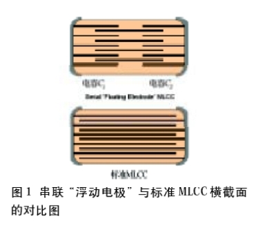 許多年前,人們發(fā)現(xiàn)在空氣中測(cè)試500VDC以上的電壓時(shí),MLCC標(biāo)準(zhǔn)設(shè)計(jì)的性能出現(xiàn)了問(wèn)題。有效層(active layer)之間的內(nèi)部擊穿和接線(xiàn)端之間的表面弧導(dǎo)致了故障的出現(xiàn)。為了解決電容器的有效區(qū)(active area)的電壓應(yīng)力問(wèn)題,制造商開(kāi)發(fā)出了一種串聯(lián)“浮動(dòng)電極”設(shè)計(jì),在單個(gè)元件內(nèi)有效集成了2個(gè)以上的電容器組。圖1是這類(lèi)設(shè)計(jì)與標(biāo)準(zhǔn)MLCC的比較。