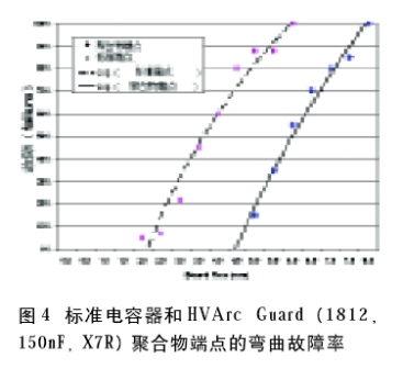 如同在前一部分中提到的那樣,焊接引線(xiàn)和涂層已廣泛用于生產(chǎn)高壓元件。除了引線(xiàn)外,引線(xiàn)框也可以用來(lái)封裝多個(gè)電容器,以得到更高的容量和增加符合性。盡管增加一個(gè)鷗翼型引線(xiàn)框會(huì)顯著增加元件的成本,但是它可以避免電路板彎曲的發(fā)生。直到最近,都沒(méi)有有效的方法來(lái)增加表面貼裝器件端點(diǎn)的符合性,但這個(gè)歷史已經(jīng)一去不復(fù)返了。通過(guò)在環(huán)氧聚合物端點(diǎn)上加上銀,可以防止電路板彎曲時(shí)發(fā)生的故障,進(jìn)而增加可靠性。這種選擇目前已用于我們的OMD-Cap范圍高壓系列設(shè)計(jì)以及HVArc Guard電容器。當(dāng)電路板彎曲時(shí),標(biāo)準(zhǔn)電容器與相同HVArc Guard電容器的聚合物端點(diǎn)的測(cè)試顯示的故障率差異如圖4所示。
