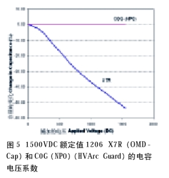 高壓電容器通常是采用X 7 R 和C0G 電解質(zhì)制造的。這些名稱(chēng)描述了在-55~+125℃溫度系數(shù)將分別為美國(guó)電子工業(yè)協(xié)會(huì)(EIA)的±15%和±30×10-6/℃。C0G電容器也可以用更常用的術(shù)語(yǔ)表示,即NP0(正負(fù)零)。不過(guò),值得注意的是,在1kHz條件下以1Vrms進(jìn)行電容測(cè)量非常重要,各種材料可以用這些名稱(chēng)來(lái)描述。對(duì)許多電源應(yīng)用來(lái)說(shuō),重要的是知道在某個(gè)具體電壓下的電容容量。X7R和C0G(NP0)電容器之間存在顯著的差異;施加了DC電壓的X7R電容器將釋放出大量容量,而C0G(NP0)電容仍然沒(méi)有太大的變化。出現(xiàn)這種現(xiàn)象是由于與C0G(NP0)電解質(zhì)的鐵電性質(zhì)相比,鐵電X 7 R 材料在剩余極化(remnant polarization)方面有根本的不同。實(shí)際上,雖然X7R MLCC具有高得多的容量,但是其容量在施加DC電壓時(shí)會(huì)顯著下降。這方面的一個(gè)例子如圖5所示。因此,當(dāng)采用多層電容器時(shí),設(shè)計(jì)人員必須考慮到施加電壓下的可用容量。