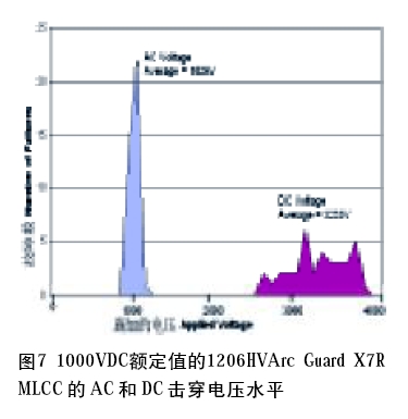 在許多應(yīng)用中,AC電源處理以及承受AC電壓的能力至關(guān)重要。測(cè)量這種能力的一種典型方法是在各種高頻條件下施加AC紋波電壓,直到電容器增加到超過(guò)環(huán)境溫度20℃以上。不過(guò),在X7R電容器與C0G(NP0)的電容器之間又一次出現(xiàn)了顯著的差異,前者的剩余電偶(remnant dipole)隨著施加的電場(chǎng)移動(dòng)而引起發(fā)熱,而后者在這種情況下的溫度不會(huì)增加。另一個(gè)AC 能力指標(biāo)是通過(guò)施加60Hz AC電壓,將其提升至6kV峰值30s 以上,直到發(fā)生電解質(zhì)擊穿而實(shí)現(xiàn)的。這種類(lèi)型測(cè)試的結(jié)果可以與對(duì)1000VDC額定值的1206 X7R HVArc Guard電容器施加500Vdc/s的破壞測(cè)試的DC擊穿電壓相比,如圖7所示。D C 電壓故障的發(fā)生遠(yuǎn)遠(yuǎn)超過(guò)了1000VDC額定值。由于A(yíng)C電壓故障發(fā)生在1000VAC左右,與DC電壓相比,故障的分布范圍很窄。