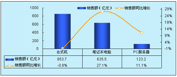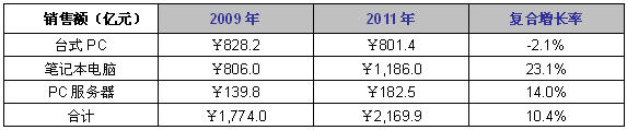2009年中國IT市場年會上賽迪顧問發布的最新研究成果顯示,2008年,包括臺式PC、筆記本電腦和PC服務器在內的PCs市場銷量達到3218.5萬臺,同比增長15.2%,銷售額為1612.4億元,同比增長9.6%,增速相比上一年都有較大的下滑。其中,臺式PC與預期相比下降最大。