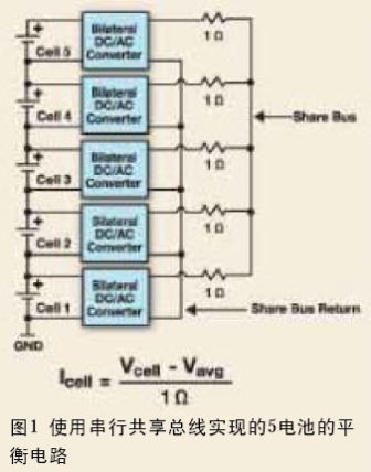 改善這種狀況的方法被稱為平衡。平衡是強(qiáng)制所有電池具有相同電壓的過程。這是通過平衡電路實現(xiàn)的。Aeroflex 平衡電路使用共享總線,這個總線的電壓等于所有電池的平均電壓。平衡電路由那些超過共享總線電壓的電池充電并將電能注入到電壓較低的電池,這個工作是通過高效率的雙邊DC/AC轉(zhuǎn)換器來完成的。平衡電流的大小與電壓差成正比,也就是說,隨著電池越來越接近理想平衡狀態(tài),平衡電流將趨近于0。圖1顯示了一個用于5個電池的平衡電路,其中,1 Ω電阻確定了傳輸比,也就是不平衡電壓與平衡電流的比值。對于容量較大(通常20Ah或更高)的電池而言,為了將達(dá)到平衡的時間減到最短,需要高達(dá)1A的平衡電流。對這些應(yīng)用而言,雙DC/AC轉(zhuǎn)換器電路通過平面變壓器工作在100kHz的頻率附近。