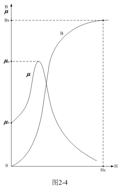 在圖2-4中,曲線B為磁通密度對應(yīng)磁場強(qiáng)度變化的關(guān)系曲線,曲線 為導(dǎo)磁率對應(yīng)磁場強(qiáng)度變化的關(guān)系曲線。由于我們這里把磁場強(qiáng)度作為自變量,而磁通密度和鐵芯導(dǎo)磁率都作為因變量,因此,我們同樣可以把曲線B和曲線 統(tǒng)稱為變壓器鐵芯的磁化曲線。