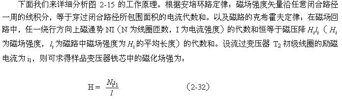 (2-34)式表明:在圖2-15中,任一時(shí)刻取樣電壓u1均與磁場(chǎng)強(qiáng)度H成正比,因此,電壓u1可以作為示波器X軸輸入電壓,用示波器的水平方向來顯示磁場(chǎng)強(qiáng)度H。