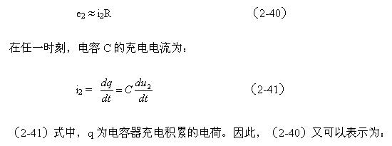 (2-39)式中,i2為流過電阻R的電流,或電容器的充電電流,u2為電容C兩端電壓。與分析變壓器初級(jí)線圈中的勵(lì)磁電流一樣,如果把積分電路的時(shí)間常數(shù)取得足夠大,電阻的阻值也取得足夠大,則在一個(gè)周期內(nèi)電容兩端的充電電壓u2相對(duì)電阻的電壓降是可以忽略的。則(2-39)式可以改寫為: