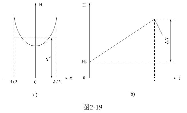 [page]圖2-19-a和圖2-19-b分別是由(2-61)式給出的,鐵芯片中磁場強度按水平方向分布的函數H(x)和按時間分布的函數H(t)曲線圖。