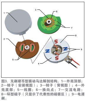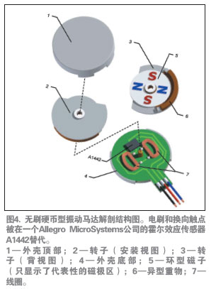 如前所述,無(wú)刷電機(jī)具有較長(zhǎng)的壽命,并由于產(chǎn)生的電火花較少,也沒(méi)有了RFI干擾。無(wú)刷直流(BLDC)設(shè)計(jì)還提供業(yè)內(nèi)直徑最小、厚度最薄的扁平振動(dòng)馬達(dá)。圖4介紹了這種馬達(dá)的基本構(gòu)造。