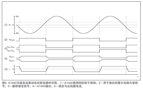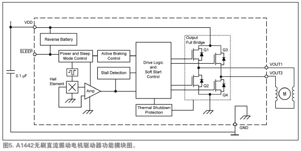 A1442是驅(qū)動(dòng)馬達(dá)唯一必須的的IC。圖5所示的功能模塊圖說(shuō)明了設(shè)備運(yùn)行和先進(jìn)的特性。注意圖4和圖5中,采用集成的霍爾傳感器免除了外部霍爾傳感器,從而減少了馬達(dá)PCB元件數(shù)量。唯一所需的外部元件是一種標(biāo)準(zhǔn)電路特性——位于應(yīng)用馬達(dá)安裝PCB上的0.1µF的旁路電容,它用于降低在開(kāi)關(guān)電源的電感負(fù)載時(shí)產(chǎn)生的瞬時(shí)電壓峰值。