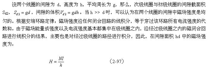 如果我們拿(2-99)式與(2-67)式或(2-94)式進行對比,可以看出,線圈漏感與線圈的電感是沒有本質區(qū)別的,只是磁路和磁通密度以及介質導磁率等參數(shù)需要根據(jù)實際情況來決定。