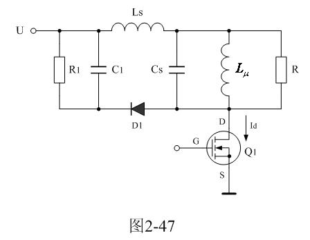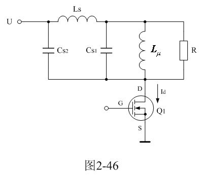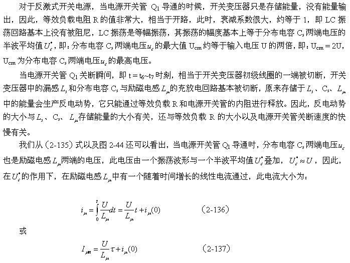 在圖2-46中,Cs1、Cs2都是分布電容,它們對于漏感 來說,既可以產(chǎn)生串聯(lián)振蕩,又可以產(chǎn)生并聯(lián)振蕩。在電源開關(guān)管Q1導通瞬間,漏感與分布電容主要是產(chǎn)生串聯(lián)振蕩,因為輸入電壓開始向串聯(lián)振蕩回路提供能量;在電源開關(guān)管Q1關(guān)斷瞬間,漏感與分布電容主要是產(chǎn)生并聯(lián)振蕩,因為漏感 必須要通過并聯(lián)回路釋放能量。在實際應(yīng)用中,漏感相對于勵磁電感 來說很小,因此如果不考慮漏感的作用,完全可以把Cs1、Cs2看成是一個分布電容。