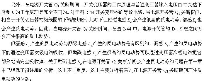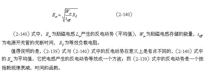 (2-140)式對于計算漏感 產(chǎn)生的反電動勢或其它電感產(chǎn)生的反電動勢同樣有效。漏感 中存儲的能量可根據(jù)(2-138)式求得;而流過漏感 的電流,對于反激式開關(guān)電源:可認為與勵磁電流的大小基本相等,因為,在反激式開關(guān)電源中,等效負載電阻等于無限大;對于正激式開關(guān)電源:可認為與流過等效負載電阻的電流大小基本相等,因為,在正激式開關(guān)電源中,勵磁電流相對于流過等效負載電阻的電流,很小。