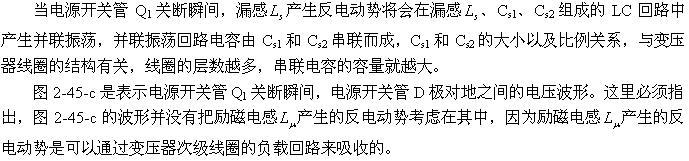 圖2-47中的D1、R1、C1是抑制漏感以及勵磁電感產(chǎn)生反電動勢和振鈴電壓幅度的有效電路。當變壓器初級漏感以及勵磁電感產(chǎn)生反電動勢時,反電動勢通過二極管D1對電容器C1進行充電,相當于電容器把反電動勢的能量吸收掉,從而降低了反電動勢和振鈴電壓的幅度。