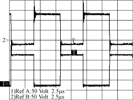 開關(guān)管S1和S的Uds波形如圖3所示,RefA為S管壓降波形,50V/div,RefB為S1管壓降波形,50V/div。電路此時工作在Vin=60V左右,S1和S的開關(guān)應(yīng)力大概為120V,D=0.5左右。圖4為變壓器輸出電壓,也就是同步整流管SR1和SR的驅(qū)動信號,正的部分為SR的驅(qū)動信號,負(fù)的部分為SR1的驅(qū)動信號。實(shí)驗(yàn)所得波形和分析的波形基本吻合,只是在開關(guān)轉(zhuǎn)換瞬間,電壓有小尖峰,這是由電路的雜散參數(shù)引起的。該電路的工作效率經(jīng)過測量大約在90%左右,基本達(dá)到設(shè)計(jì)的要求。