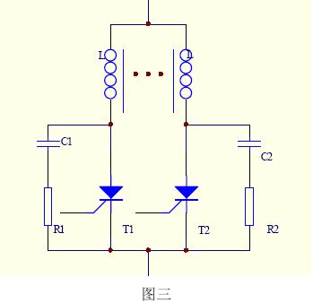 由于單個元件耐壓水平的提高,每個元件并聯工作以增大設備功率的情形更常見,以兩只晶閘管并聯工作為例,如圖二所示。