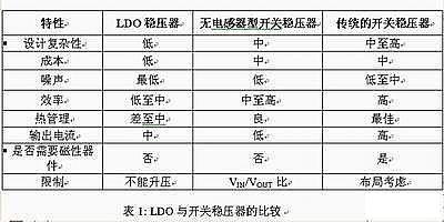 對(duì)于可滿足手機(jī)內(nèi)部電源轉(zhuǎn)換需求的不同電壓穩(wěn)壓器,我們必須認(rèn)真考慮它們的優(yōu)缺點(diǎn)(見表1)。目前有三種選擇:線性LDO穩(wěn)壓器、無(wú)電感型開關(guān)穩(wěn)壓器(亦稱為充電泵)以及傳統(tǒng)的開關(guān)穩(wěn)壓器(基于電感器)。